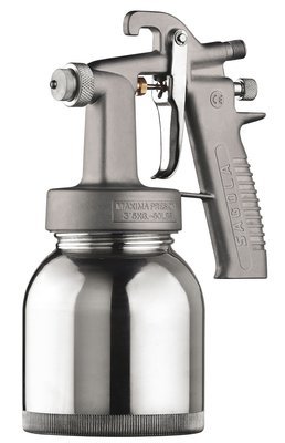 Pistola presurizada con boquilla de mezcla interna que permite trabajar con un bajísimo consumo -sólo 65 L/min- y muy baja presión -1-2 bar-.